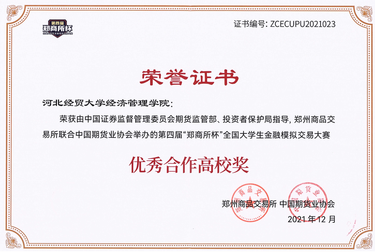 近日,第四届“郑商所杯”全国大学生金融模拟交易大赛落下帷幕并揭晓获奖情况。我院首次参加此项竞赛,实现了期货期权领域专业竞赛的历史性突破,在参赛师生的共同努力下,同浙江大学、南开大学等全国77所高校一同荣获优秀合作高校奖。