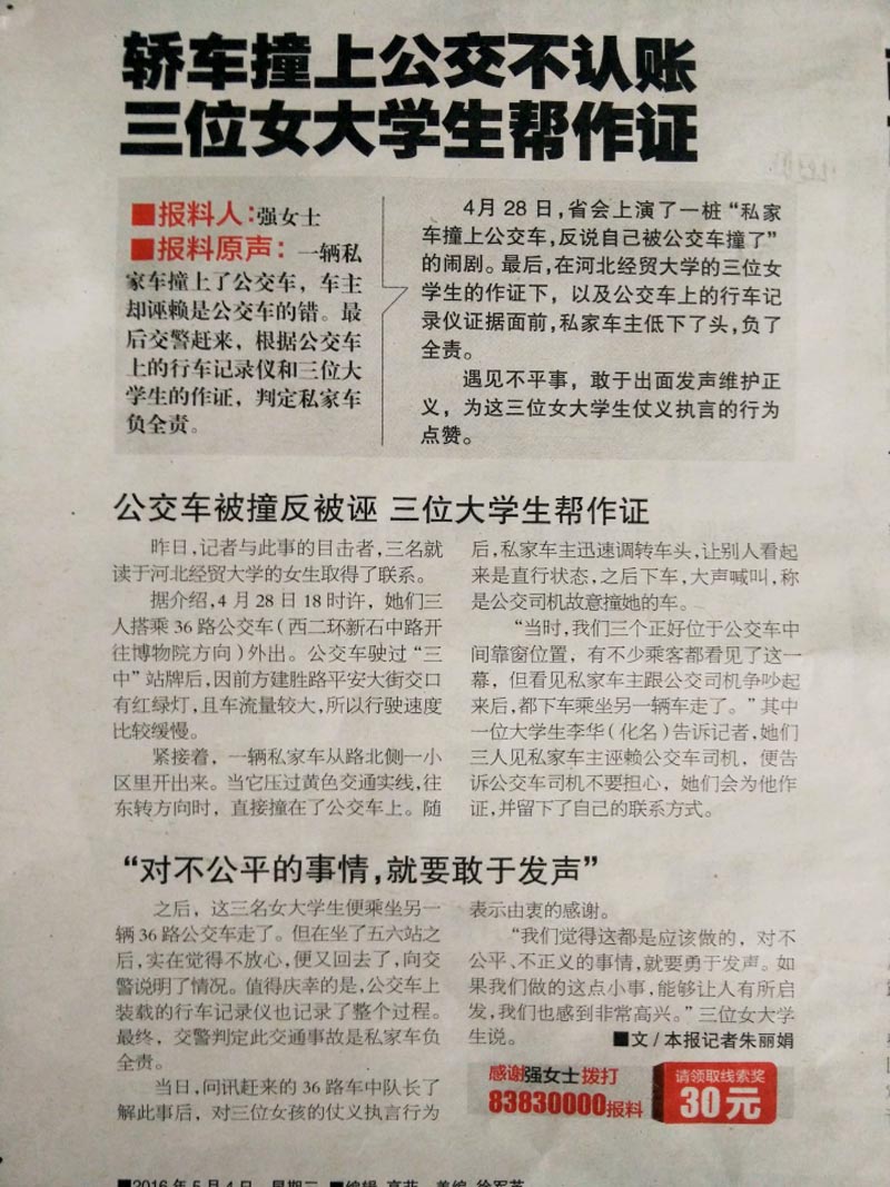 5月4日,青年节之际,我院三位大学生为维护正义仗义执言的先进事迹登上《河北青年报》,经了解得知,原来是4月28日,一辆私家车撞上公交车后反诬是公交车的错,我院管理系学生刘家畅、张新竹、王玉宁恰好目睹了这一幕,她们出手相助,还公交车司机以清白。学院党委决定对她们的行为予以表彰。