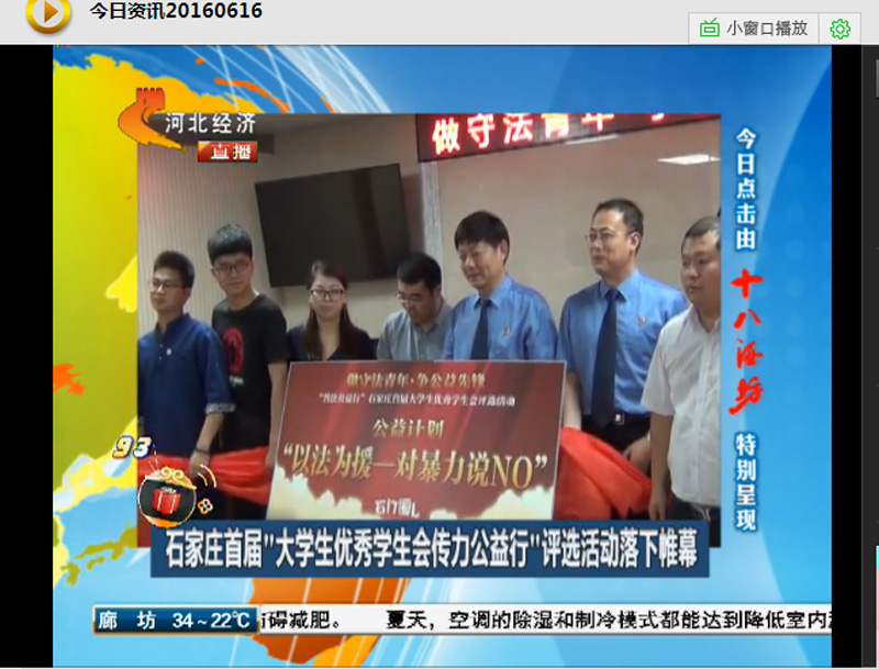 活动的举办旨在拓展大学生课外活动和社会服务形式,让大学生在步入社会之前,更多的提高法律意识、增强法律常识,开展自我保护,用公益的形式传递正能量,河北广播电视台《今日资讯》栏目,《河北青年报》等多家媒体给予了报道。随着评选活动的结束,公益计划全面启动,我院 “以法为名——对暴力说NO”公益活动项目将在省会13所高校内全面开展。