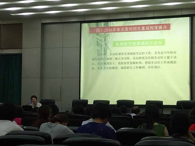 6月16日下午,我院2016年高考招生宣传部署工作会在图书馆报告厅举行。学院党委副书记刘会娟、各系党总支书记、各系主任,学院各部门负责人、学工部全体人员以及全体辅导员参加会议。