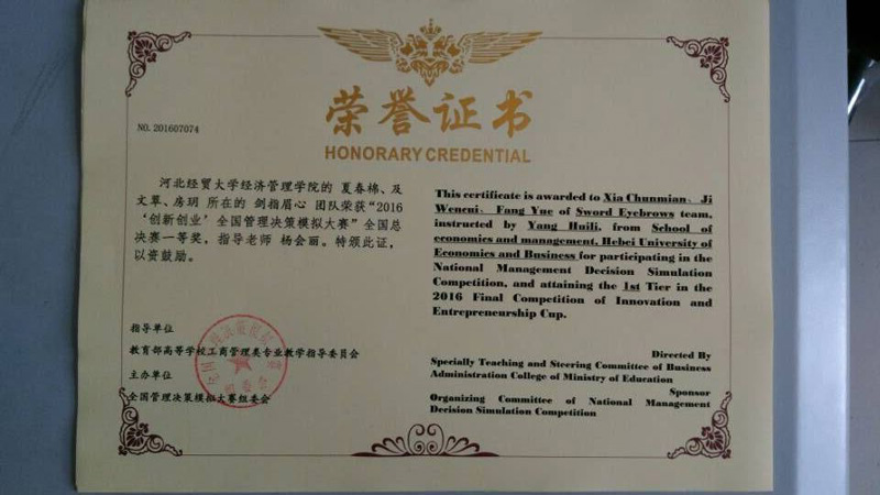 7月19日,2016年“创新创业”全国管理决策模拟大赛总决赛在内蒙古工业大学举行,此次大赛由全国管理决策模拟大赛组委会主办,教育部高等学校工商管理类专业教学指导委员会为指导单位。全国96所大学派代表队参加,我院由2013级财务管理1班夏春棉、财务管理6班及文翠、财务管理8班房玥三位同学组成的代表队,经过层层选拔,最终挺进国赛,脱颖而出,荣获总决赛一等奖。