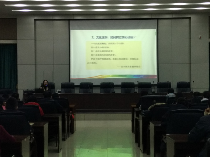 11月7日晚,我院邀请马克思主义学院李英副教授以《习近平总书记的治国理政思想》为主题的专题讲座,学院党委副书记刘会娟出席,学生工作部、团委、各系团总支书记、学生社团学“习”会全体成员、以及大一新生班委三百余人参加。