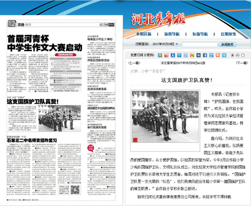 5月17日,河北广播电视台少儿科教频道《校园新鲜爆》栏目以《2138CC太阳集团志愿服务合作路小学基地挂牌成立》为题,对我院在合作路小学建立“党员、团员、少先队员”国旗护卫队志愿服务基地进行专题报道。5月9日,河北青年报以《这支国旗护卫队真赞》为题对该活动进行报道。