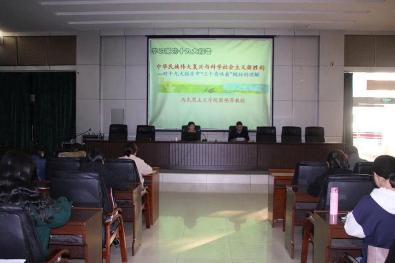 柴艳平从党的十九大报告的主题入手,围绕中华民族辉煌的古代和中华民族倍受磨难的近代,深入浅出的讲解了“什么是中华民族伟大复兴”等核心问题,重点阐释了“三个意味着”等重要内容,并鼓励同学们要坚定道路自信、理论自信、制度自信和文化自信,牢牢把握历史机遇,为建设有中国特色社会主义而不懈奋斗。