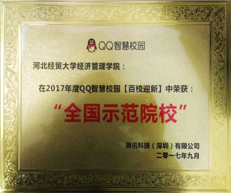 2017年9月至今,腾讯科技(深圳)有限公司对开学季参与QQ智慧校园迎新工作的全国百余所院校进行了评比,扎实的工作、灵活的运用使我院荣获“全国示范院校”荣誉称号。