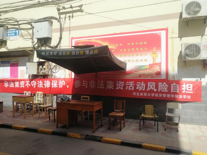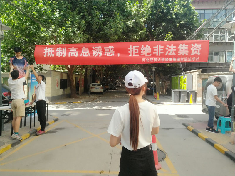 本次活动以“防范非法集资、构建和谐校园”为主题,重点结合防范非法集资的相关法律法规和政策、解答师生群众关切的问题开展集中宣传,活动采取发放宣传资料等方式进行。主场地设在校园甬道,法学社志愿者们过往师生发放宣传资料;志愿者们还走进学院家属区发放宣传单,向家属区的老人们宣讲政策法规,引来不少居民驻足聆听。