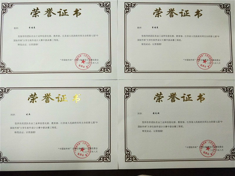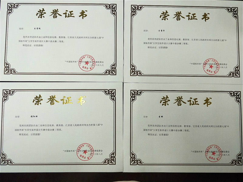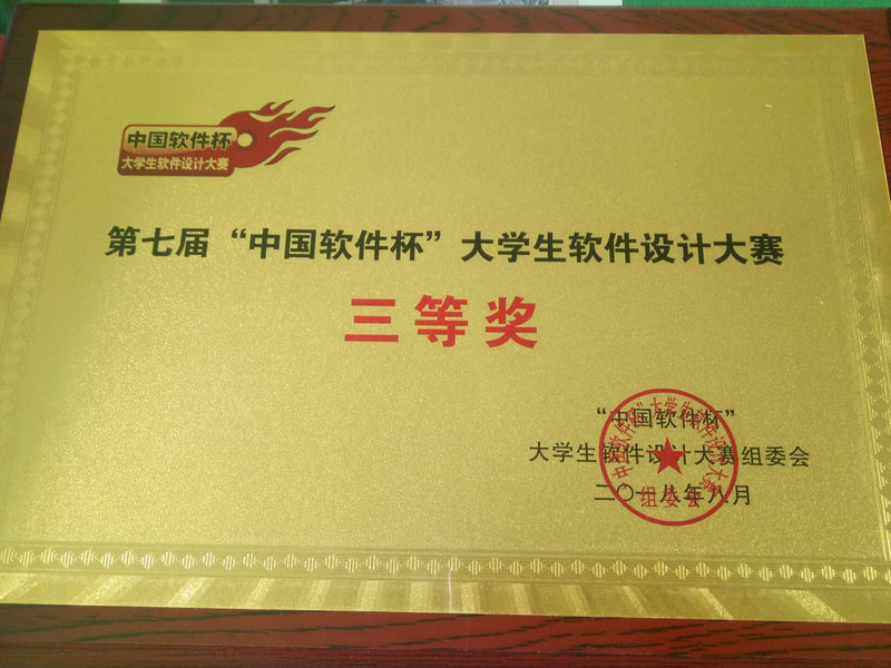 近日,第七届“中国软件杯”大学生软件设计大赛总决赛在南京国际博览中心举行。我院由信息系王雪纯、王雪年、张红羽组成的经管一队和黄文硕、刘兵、李娜组成的经管二队分别荣获团体三等奖,为学院争得了荣誉。