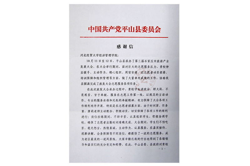 10月11日至12日石家庄市第三届旅游发展大会在平山县举行,接到平山县团委的请求,我院派出100余名志愿者分赴西柏坡游客中心、富力健康养生城、泓润生态园三个核心片区开展志愿服务活动,期间他们在岗前拉练、接待引导等工作中表现积极突出,得到主办方的一致好评,其中29名同学被团市委授予“优秀志愿者”荣誉称号。中共平山县委及平山县政府特别写来感谢信对学院在志愿者招募、培训保障、组织管理等方面的主动作为和精心安排表示衷心地感谢。