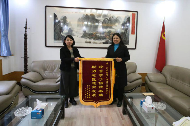 11月13日下午,平山县团委副书记王秋静代表平山县团委将一面“经管学子倾情奉献助力老区蓬勃发展”的锦旗送到学院党委副书记张丽英手中,对10月中旬我院志愿者在石家庄市第三届旅游发展大会中给予的支持和帮助表示感谢,同时将平山县委县政府的一封感谢信送到院党委书记张进良手中。