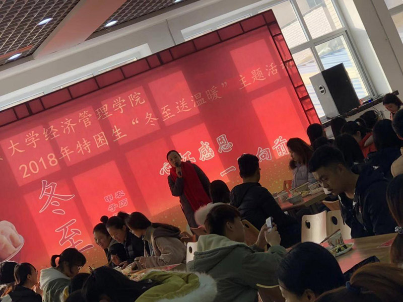 12月22日,我院学生工作部举办“冬至送温暖”主题活动,邀请学院400多名家庭经济困难学生在学院第一餐厅一起吃饺子,过冬至。活动由学生工作部邱学亮老师主持。