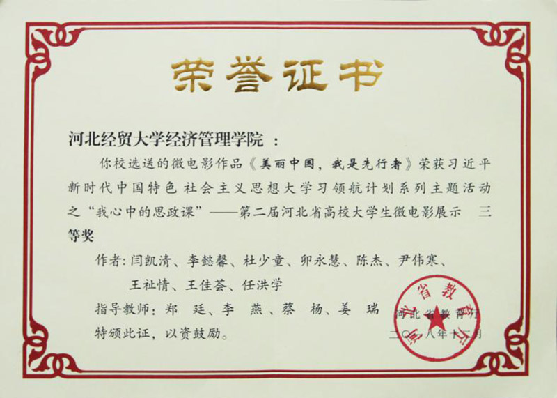 “我心中的思政课”第二届河北省高校大学生微电影展示活动作为省教育厅组织的习近平新时代中国特色社会主义思想大学习领航计划系列主题活动之一,共吸引省内30多所高校参与。我院会计系学生闫凯清带领团队拍摄的《美丽中国,我是先行者》荣获三等奖,蔡杨、李燕、郑廷、姜瑞获得指导教师奖。