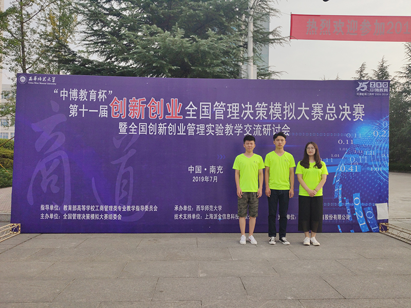 7月21日至23日,2019“创新创业”全国管理决策模拟大赛总决赛在四川南充西华师范大学(华凤校区)举行。我院派出由2017级工商管理1班赵鹏、2017级市场营销1班宁艳朵和市场营销2班任广东组成的“明日之星”代表队参加了本次比赛。通过三位同学的不懈努力,一路过关斩将,脱颖而出,以行业第三的好成绩荣获全国总决赛一等奖。