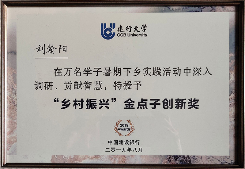 我院经济系16级金融6班的刘翰阳同学参加了实践活动。他在深入阜平县农村地区开展实践调研的过程中,努力将金融知识、金融服务、专业技能传递到村民家中,帮助村民做一些力所能及的事,获得了村民的一致肯定。在建设银行阜平支行陈子达行长和班主任韩璐老师的指导下,刘翰阳同学撰写的《阜平县关于精准扶贫及金融科技振兴乡村的研究》社会实践报告,结合了阜平地区近年来的变化以及下乡实践获得的真实数据,对该地区的现状以及贫困原因进行了客观的分析,详细论证了如何将金融和科技这两个脱贫关键力量注入到贫困地区,并且提出了创新性的建议。其实践报告获得了河北省建设银行颁发的优秀征文奖,实践报告中提出的“金点子”建议,获得了中国建设银行总行颁发的“金点子创新奖”。