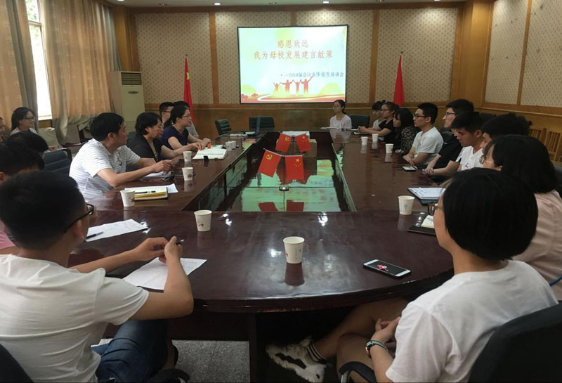 615日下午,会计系在西校区一楼会议室举行“感恩致远,我为母校发展建言献策”2018届毕业生座谈会。会计系党总支书记蔡杨、主任王慧霞、西区后勤部黄玉玢老师、弋建嵩老师出席,20多位毕业生代表参加了座谈。
