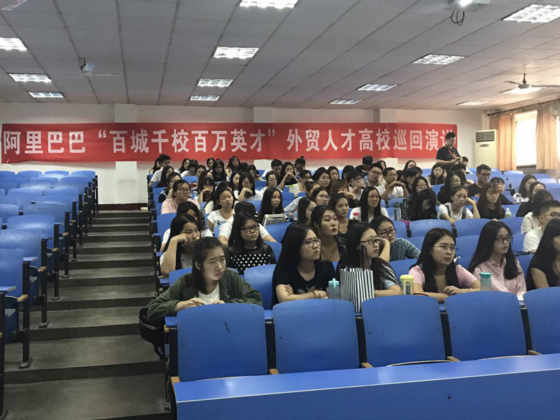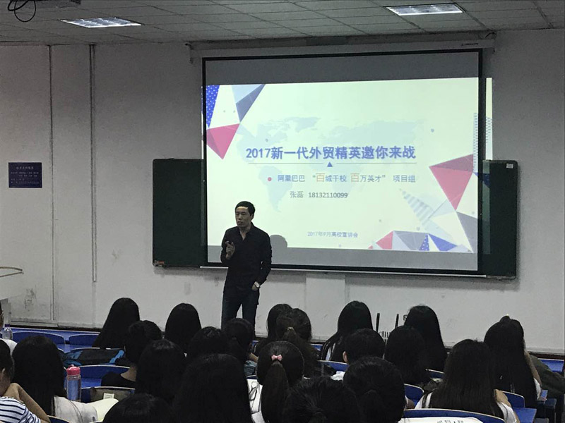 926日,阿里巴巴“百城千校百万英才”外贸人才高校巡回演讲会在北校区院第二教学楼105教室举行。阿里巴巴衡水站总经理王朝军、优秀员工代表张磊、孙佳做主旨宣讲,商务系书记廖俊峰出席,国贸、电商专业共计150名大四学生聆听了讲座。