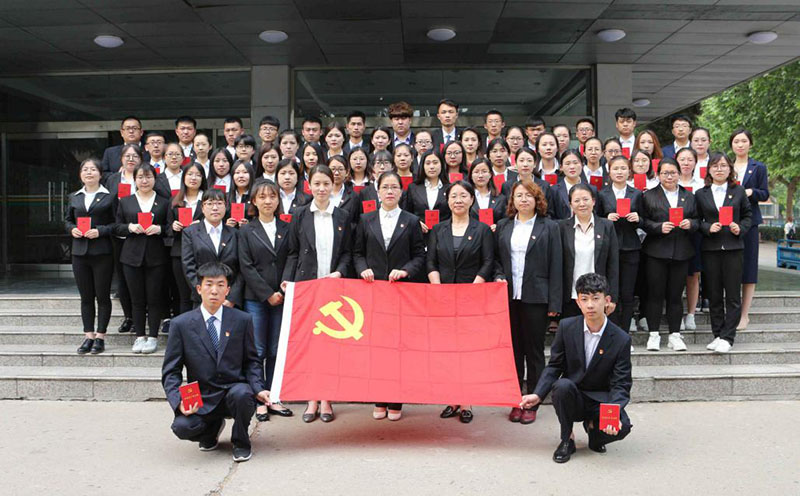 会计系党总支委员王慧霞宣读了学院党委关于接收57位新党员的批复。在总支委员的带领下,57位新发展党员面向党旗,庄严宣誓。宣誓完毕后,全体总支委员和组织部长陈玲向每位预备党员颁发了《中国共产党章程》,佩戴党员徽章。最后,由预备党员代表发言,宣誓仪式在庄严的国歌声中圆满结束。会后,本期新发展党员合影留念。