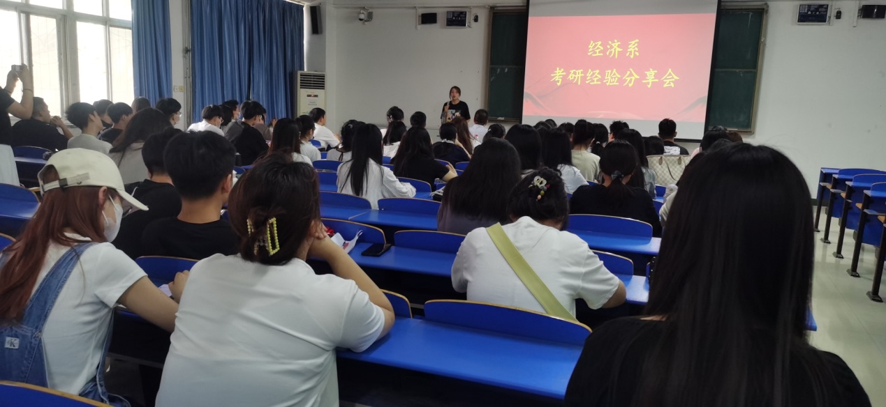 经济系在充分摸底调研2024届毕业生考研情况的前提下,为帮助同学们提前明确考研目标,掌握考研技巧,了解更多考研信息,5月29日下午,我系在南三教102举办“逐梦青春 研途有你”考研经验分享会,系党委书记蔡杨、主任张瑞锋及100余名学生参加。