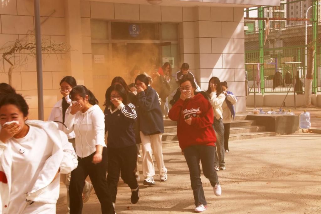 随着演练指令的发出,宿舍楼内呈现模拟火灾场景。警报声响起,烟雾弥漫,学生们在安全疏导人员的引导下,迅速按照预定的逃生路线有序撤离。整个过程中,学生们展现出了冷静且迅速的应急反应能力。