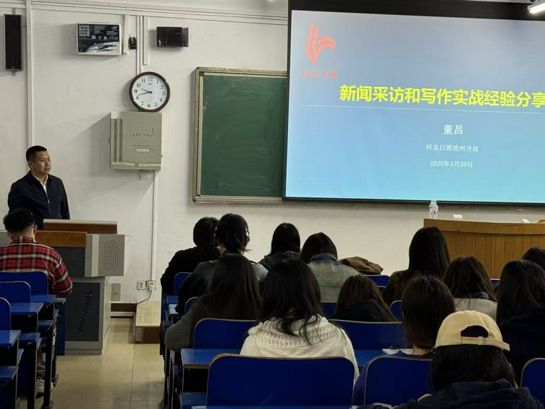 近日,文法系邀请河北日报沧州分社社长董昌为2023级新闻专业学生作题为《大学生校园新闻作品点评》的学术报告。