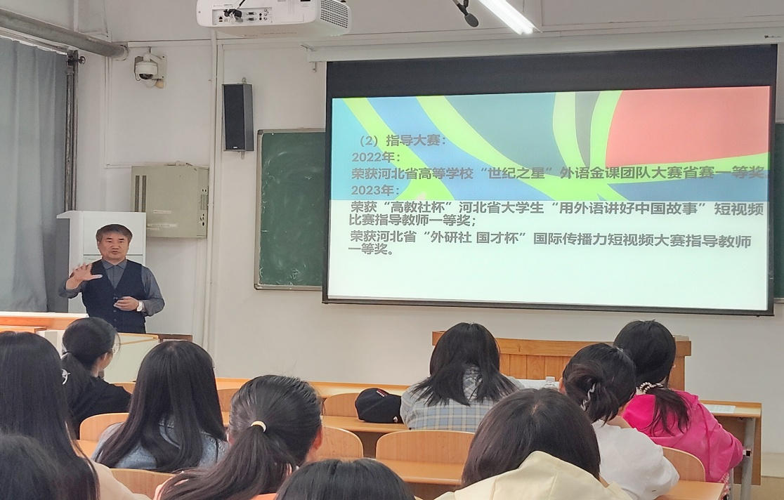 赵占亚首先结合自身教学经历与学院竞赛成果,围绕英语水平提升与学科竞赛参与介绍了成立2025级新生英语特训营的意义初衷和近期即将推出的系列活动。在竞赛宣讲环节,赵占亚就“高教社杯”河北省大学生“用外语讲好中国故事”短视频大赛等5项英语短视频大赛、“外研社Ÿ国才杯”“理解当代中国”全国大学生英语能力大赛等6项英语国家级赛事和2138CC太阳集团思政英语词汇大赛等3项自主研发英语赛事的主办单位、大赛级别、大赛时间、大赛主题、赛制安排、参赛流程、注意问题、大赛成果进行了细致梳理和翔实解读,为新生分享经验、指引方向。他希望同学们尽快认识大赛,全面了解大赛,尽早准备,找到自己的努力方向,把握提升英语技能的宝贵机会,争取更好的比赛成绩。整场讲座内容丰富,干货满满,学生参与热情高涨,师生互动现场热烈。