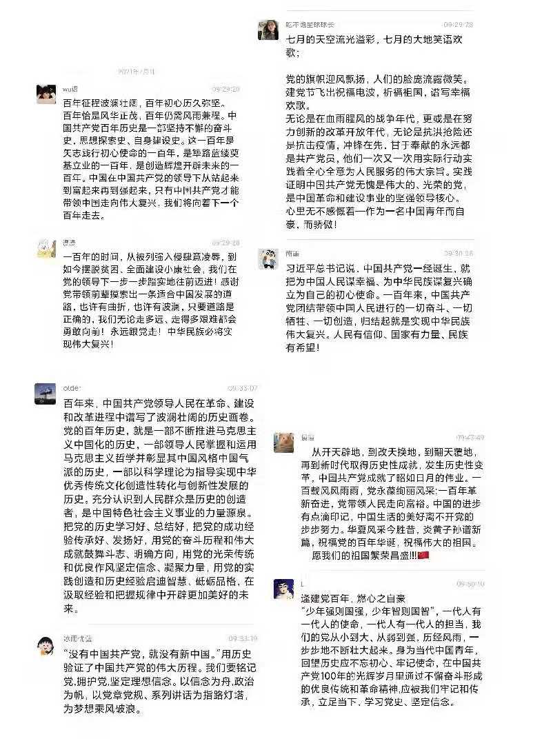 学院领导张进良认为,人民有信仰、国家有力量、民族有希望,何其有幸,生于华夏,见证百年,作为一名老党员一定要立足百年大党新起点,坚守初心,牢记使命,砥砺奋进。