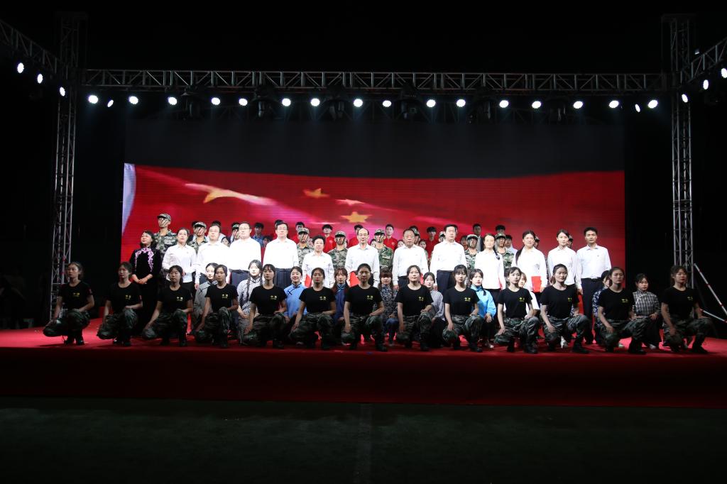 第三章扬国旗。扬国旗,赞祖国,争做新时代的建设者。学院领导班子集体创作参演的原创诗文朗诵《百年征程》,用慷慨激昂声音讲述了党在每个关键历史节点的重大事件,讲授了共产党人的精神谱系,号召全体师生学党史、知党恩、听党话、跟党走,勇担当、敢先锋,争做新时代的建设者。
