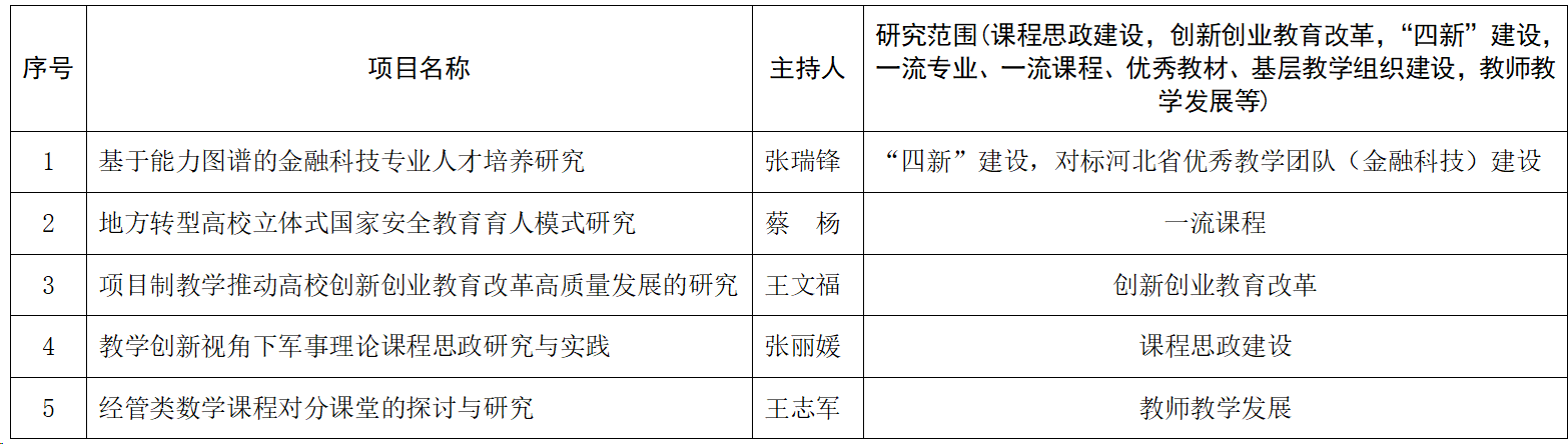 根据《河北省教育厅关于开展2025年河北省高等教育教学改革研究与实践项目申报工作的通知》(冀教高函[2024]52号)要求,我院组织了项目申报工作。经个人申报、学院审核推荐,本次申报项目共8项。经专家评审,最终推荐5项申报河北省高等教育教学改革研究与实践项目,现对评审结果予以公示。