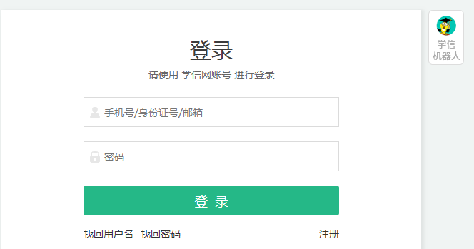 4、点击登录学信档案,输入“用户名”+“密码”后点击“登录”;(2025届毕业生在入学核对学籍信息时均已注册过学信网账号,如果登录失败请点击“找回用户名”或“找回密码”,如无法找回,可点击右上方“学信机器人”或联系学信网客服解决)