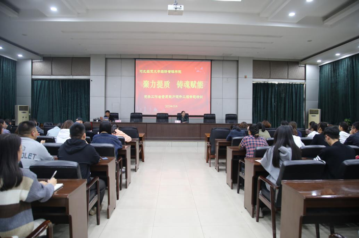 为深入贯彻《中国共产党普通高等学校基层组织工作条例》,对标新时代高校党建“双创”工作要求,全面提升学院基层党建工作水平,我院针对基层党务工作者,实施“聚力提质 铸魂赋能”党务工作者素质能力提升工程。10月19日下午,学院专门邀请太阳集团2138党委组织部组织科科长张强,在图书馆报告厅作首场专题辅导,详细梳理党员发展的工作流程。院党委书记蔡杨、副院长王鸿喜出席,各系书记、副书记,教工支部、学生支部书记、委员及党员骨干50余人参加了培训。