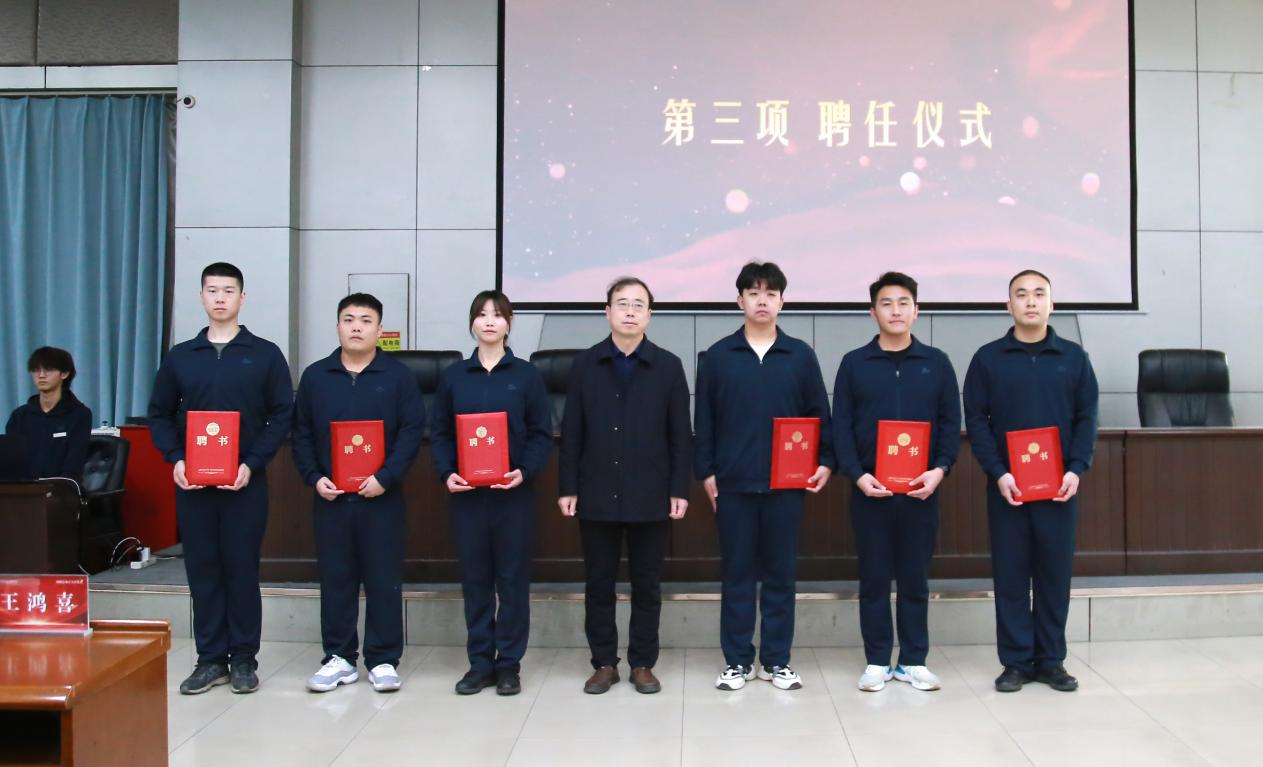 聘任仪式上,王鸿喜为2024届国防后备营干部授任命聘书,郝丙涛、温嘉豪、王孜龙、刘雅轩、贾钧伟、李梓豪6人分别就任后备排长、指导员等职务,为后备营的组织建设增添了坚实力量。