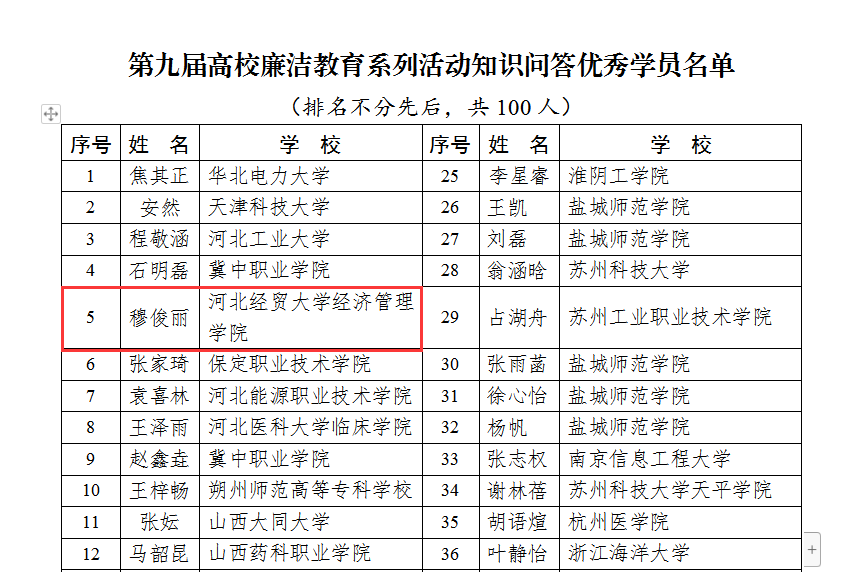 《输赢皆在廉腐之间》由文法系2022级新闻2班王晶设计,党委宣传部郑廷、大学宣传部姜瑞、段盛杰指导,该设计作品运用对比和拟人的手法,将“廉”与“腐”二字刻画成“获奖者”和“入狱者”的形象,反腐倡廉的主题跃然纸上,作品旨在倡导崇廉拒腐的社会风气,传递出积极向上的价值观。高校廉洁教育系列活动知识问答全国仅有100名学生上榜,我院商务系2022级电子商务2班学生穆俊丽以优异的成绩入选。