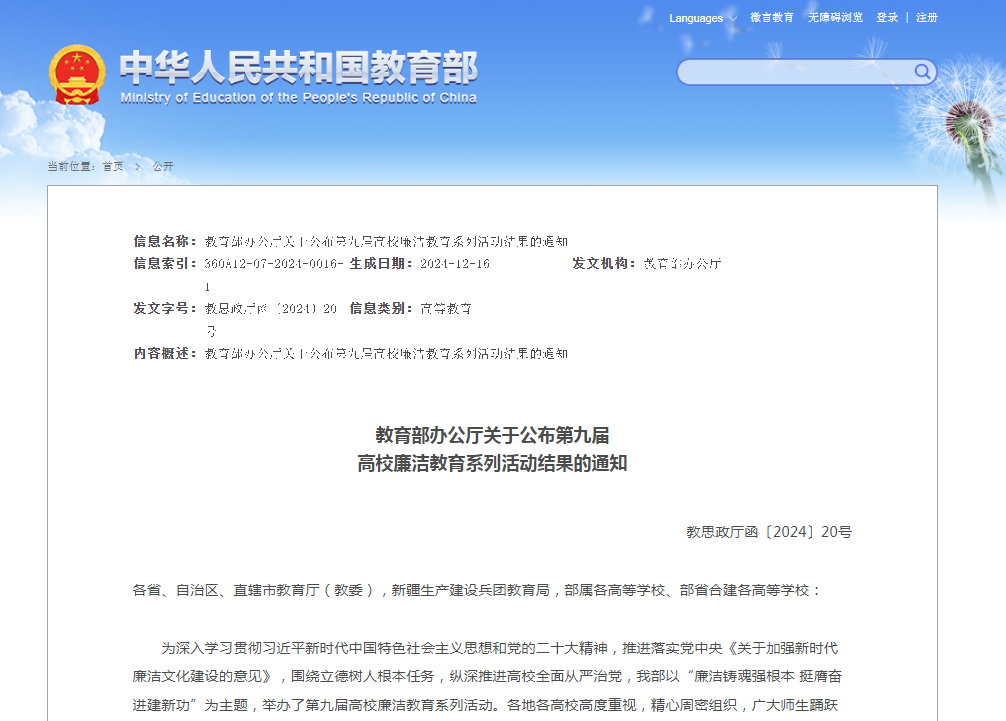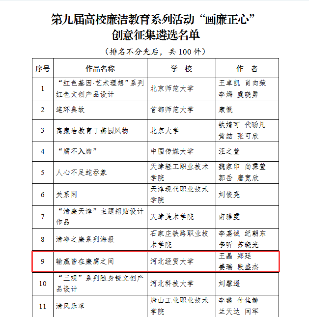 近日,教育部办公厅公布第九届高校廉洁教育系列活动结果。我院通过廉洁文化月活动征集并选送的作品《输赢皆在廉腐之间》入选系列活动“画廉正心”创意征集遴选名单;穆俊丽入选系列活动知识问答优秀学员名单。