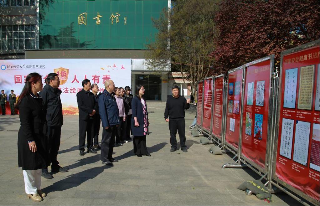 为深入贯彻落实总体国家安全观,增强师生国家安全意识,4月14日,我院以“全民国家安全教育日”为契机,在图书馆前广场举办“国家安全教育日师生书画摄影作品展”,展现师生对守护国家安全的理解。学院领导和国家安全教研室教师参观了展览。