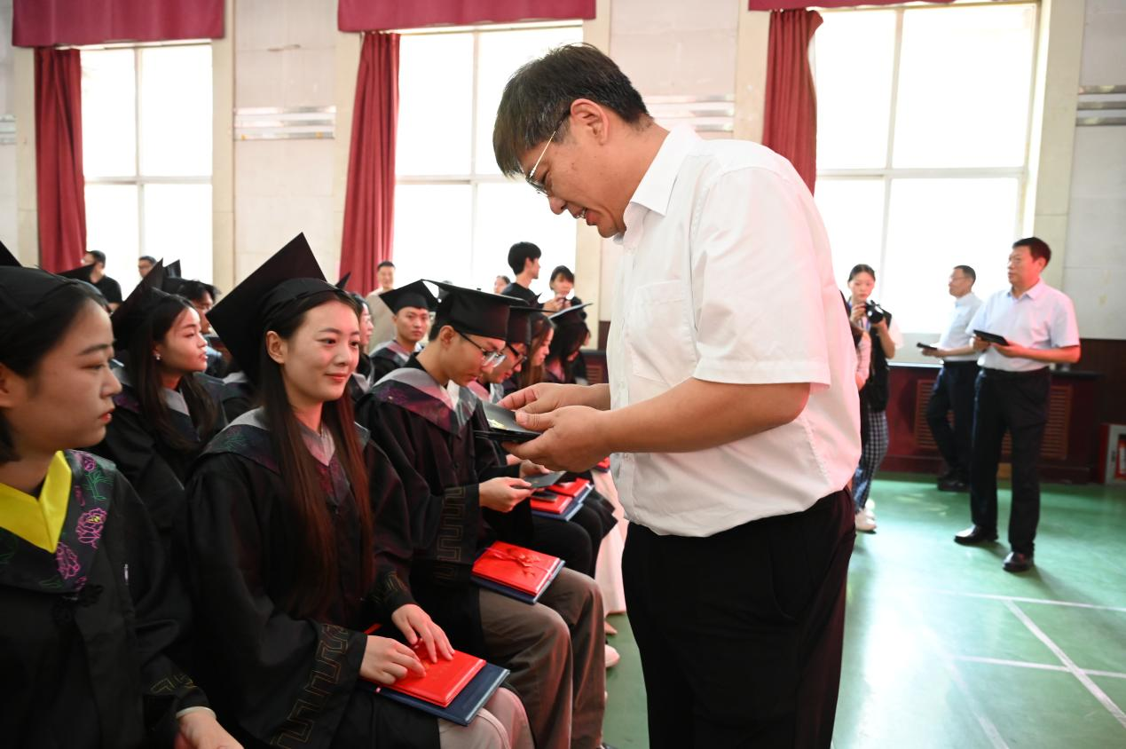 6月12日上午,我院2025届大学生毕业典礼在学院礼堂隆重举行。校党委副书记王保军出席典礼,学校办公室副主任傅昕、学院领导、各系部负责人及毕业班辅导员、毕业生代表500余人参加。典礼由院党委副书记刘佳主持,院长李大庆致辞,副院长王鸿喜宣读了2025届优秀毕业生表彰文件。