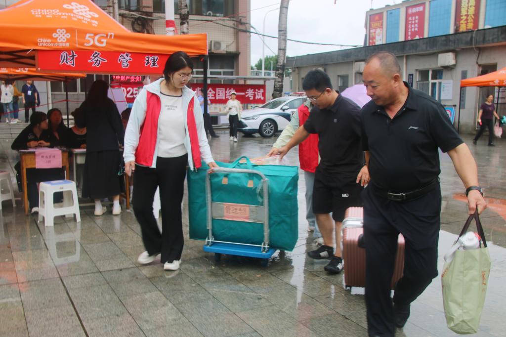 雨中,各系书记、辅导员早早到岗,指导新生报到工作。志愿者们穿梭在校园的各个角落,主动为新生与家长指引路线、搬运行李、解答疑问,从报到点至宿舍区形成了一条高效而温暖的“绿色通道”。志愿者们忙碌的身影和热情的笑容,成为秋雨中最动人的画面,也让初来乍到的新生与家长倍感亲切。