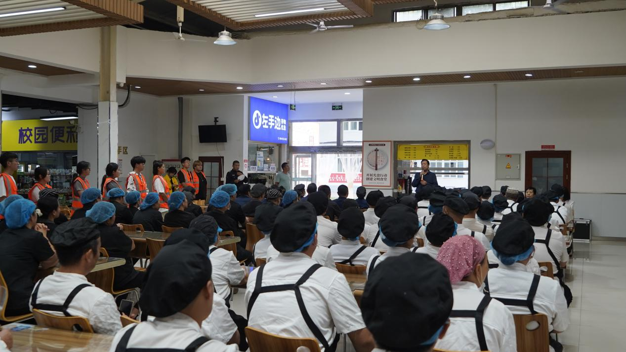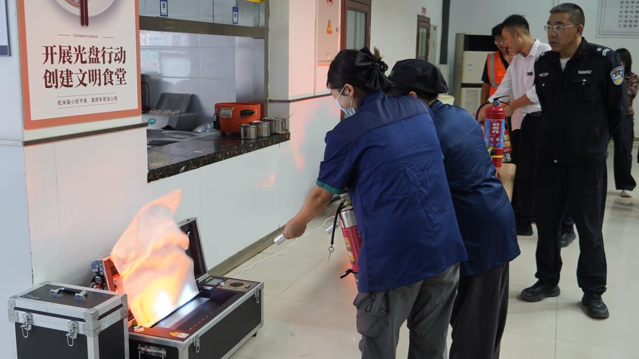 张进良强调,食堂是校园安全工作的重点区域,员工必须熟练掌握消防器材使用技能,做到“遇火不慌、扑救及时”。安全工作部人员通过现场演示,详细讲解了灭火器、消防水带等器材的使用要领与注意事项。现场员工神情专注,认真学习操作规范。
