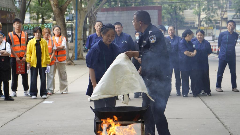 在户外真实火源演练现场。参训员工在安全工作部人员的指导下,分组练习使用灭火器与灭火毯进行扑救。在教官指导下,员工成功用灭火毯覆盖燃烧的油锅,瞬间压制火苗。整个过程紧张有序,浓烟与火焰的真实场景让员工深刻体会到火险的紧迫性。
