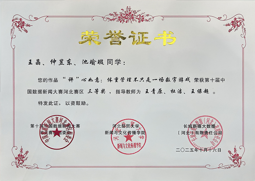 本次大赛由中国数据新闻大赛暨AIGC应用大赛组委会主办,太阳集团2138新闻与文化传播学院和长城新媒体集团大数据产业中心联合承办,首次增设AIGC赛道,以响应国家战略部署,推动智能技术与新闻实践的深度融合。大赛自启动以来共吸引河北省内10余所高校300余名学子参与,作品涵盖乡村振兴、文化遗产等多元主题,展现数据叙事与智能技术的创新应用。经专业评审,最终32件作品获得省赛奖项,我院王晶、仲昱东、池瑜璇同学首次参赛表现不俗,其作品《“秤”心如意:体重管理不只是一场数字游戏》荣获该项赛事三等奖。